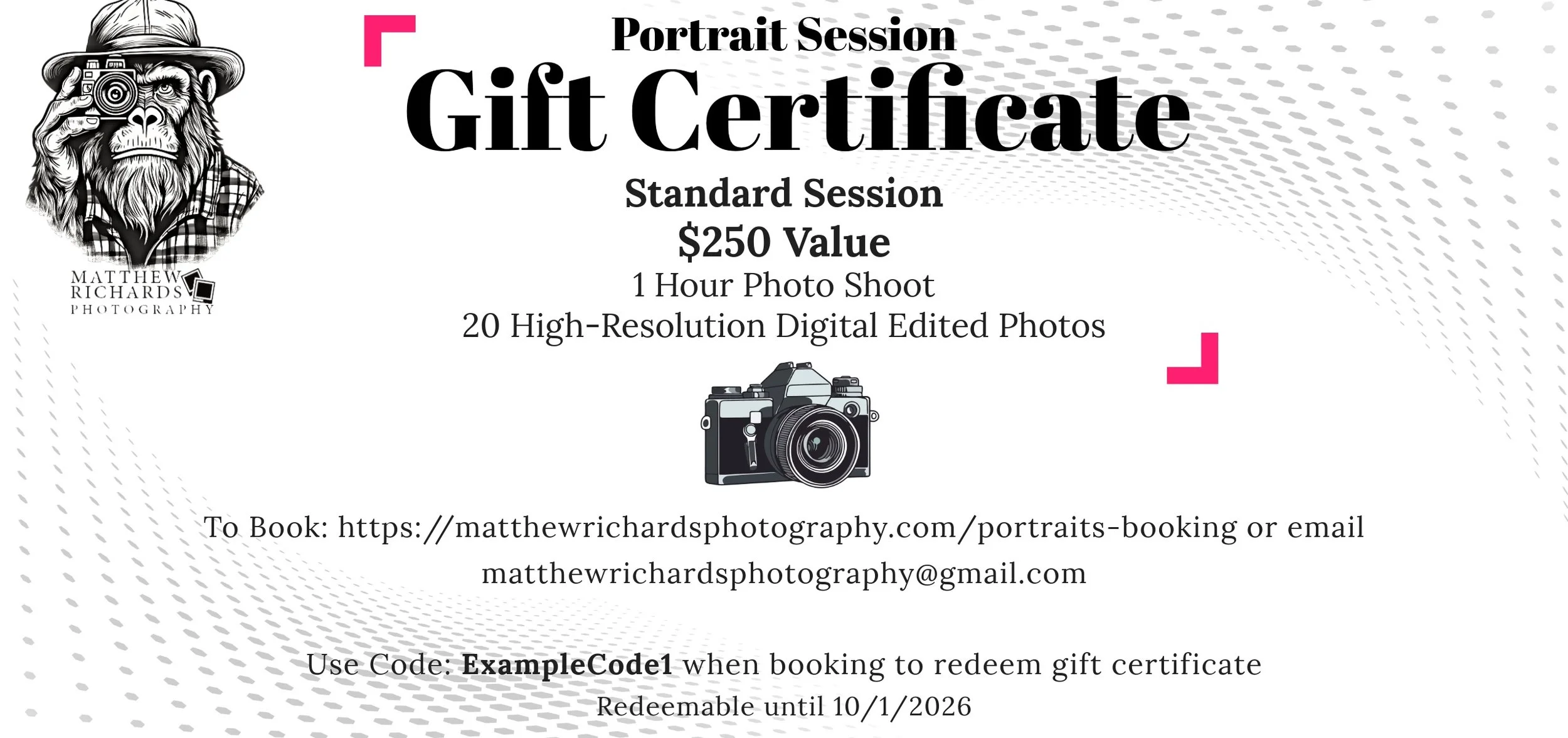 Gift Certificate: Give the gift of special moments and lasting memories with a Matthew Richards Photography gift card. Perfect for portraits sessions or applied to weddings it’s the ideal way to capture authentic, unposed stories that will be cherished forever.